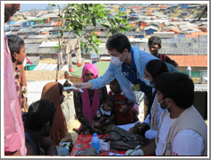 その後、ハキンパラ難民キャンプから車で10分程離れているバルカリー難民キャンプのモバイルクリニックを訪問し、診療支援活動を行いました。風邪や急性上気道炎の症状がある子共たちに対して、昨日のように鼻腔内清拭を行ったところ、多くの子供たちが列を作って並び始めました。DCHTの若い女医であるDr.ディパはとても丁寧に診療をしています。疲れの出てきた若い母親たちの話を聞いてあげることが、カウンセリングになっているようです。途中でパラメデックスの方に声をかけられ往診へ。仮設テントの中には70歳の女性が横たわっていました。体温は38.3度で、血圧は保たれていましたが、脱水がひどく意識も混濁していたため、国境なき医師団(MSF)が運営しているPrimary Health Center(PHC)への搬送を助言しました。